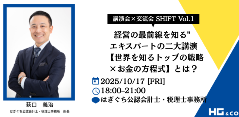 【弊社代表の萩口が登壇!】【講演会×交流会 SHIFT Vol.1】経営の最前線を知る” エキスパートの二大講演 【世界を知るトップの戦略 ×お金の方程式】とは?