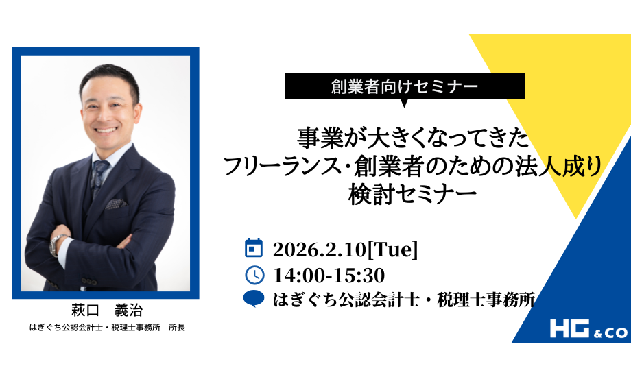 弊社のオンラインセミナーとして、企業/創業者向けセミナー「事業が大きくなってきたフリーランス・創業者のための法人成り検討セミナー」を開催いたします。