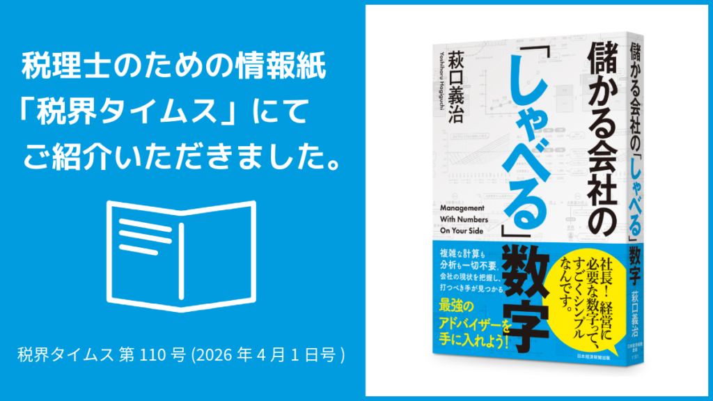 税理士のための情報紙「税界タイムス 第110号(2026年4月1日号)」の書籍紹介にて、弊社代表の萩口義治の著書『儲かる会社の「しゃべる」数字』(日経BP 日本経済新聞出版)をご紹介いただきました。 【税界タイムス 第110号(2026年4月1日号)】 ▼税界タイムス ...